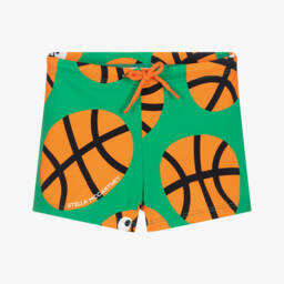 Boys silky turquoise blue swim shorts by Stella McCartney Kids, with a logo letter print in collaboration with Nickelodeon and SpongeBob SquarePants. Lightweight and comfortable, they are quick-drying and have a mesh lining. The stretchy, elasticated waistband has a logo jacquard, buckled belt on the front, providing a secure fit, whilst large velcro-fastening side pockets add a practical touch.