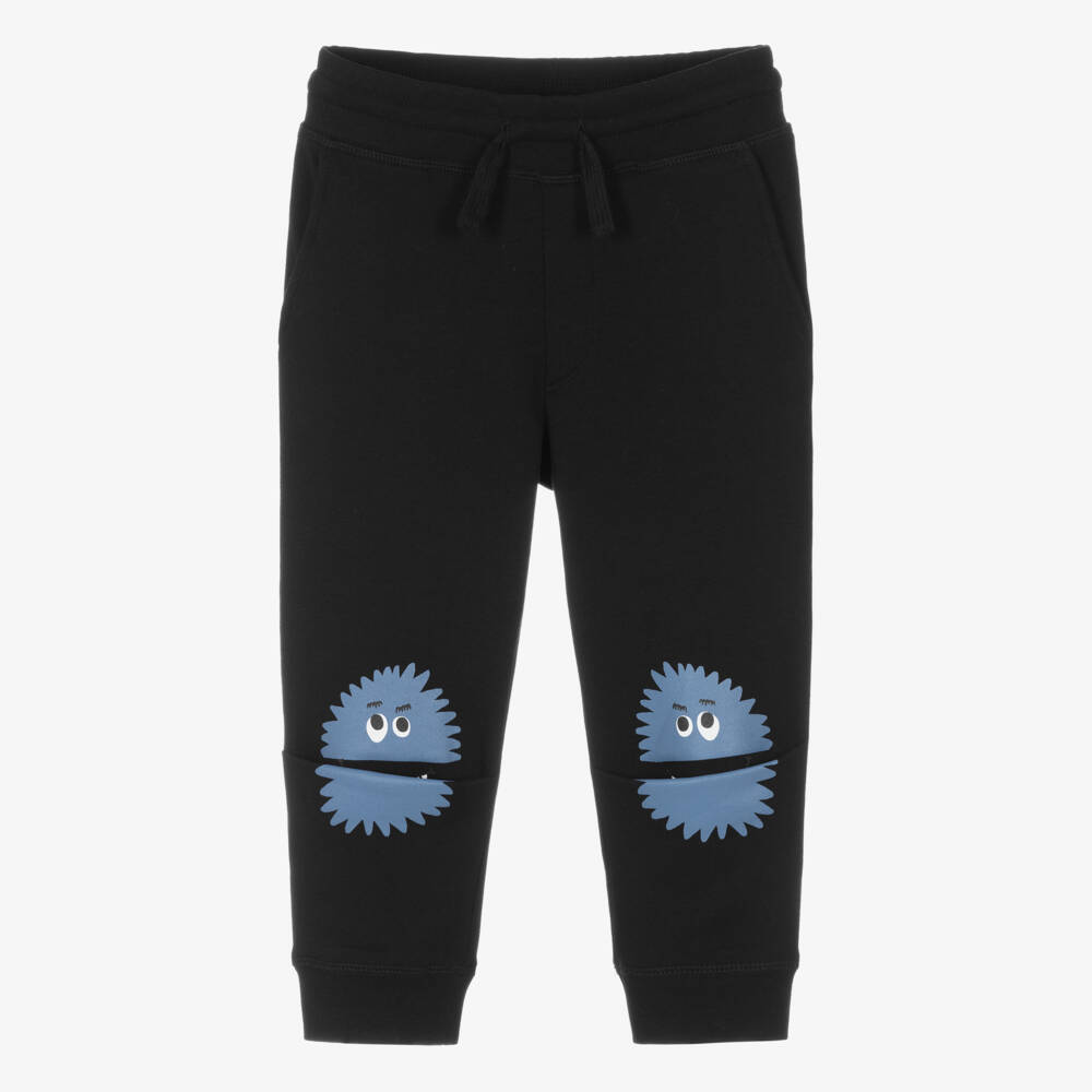 Black organic cotton joggers for boys from Stella McCartney Kids. Gentle on the skin, these soft and comfortable cuffed joggers are made in stretchy, medium-weight jersey, with a softly elasticated, drawstring waist. With fun blue monster prints, the joggers have pleated fabric on the knees which unfold to reveal friendly smiling faces. Convenient side pockets complete the design. The Stella McCartney fit can be quite small so choose a size up if you want room to grow.