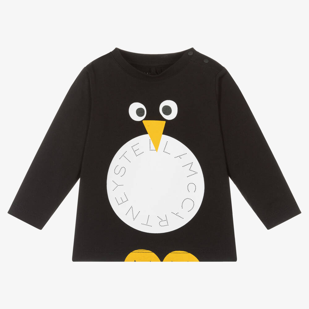 Adorable black long-sleeved top for little boys by British brand Stella McCartney Kids. Made in soft organic cotton jersey, this comfortable top is printed with a sweet penguin with the brand's circle logo incorporated for a designer touch. Easy-to-use poppers on one shoulder make dressing fuss-free. The Stella McCartney fit can be quite small so choose a size up if you want room to grow.