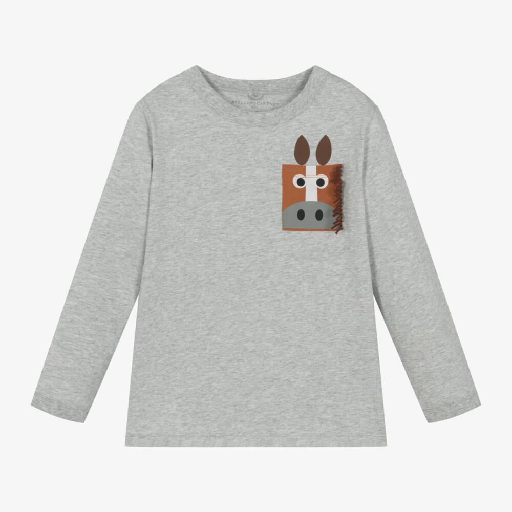 Grey marl, long-sleeved top for boys by Stella McCartney Kids, made in comfortable organic cotton jersey with a ribbed crew neck. Adding the British designer's signature playful touch, it has a fun chest pocket in a brown horse design. The Stella McCartney fit can be quite small so choose a size up if you want room to grow.