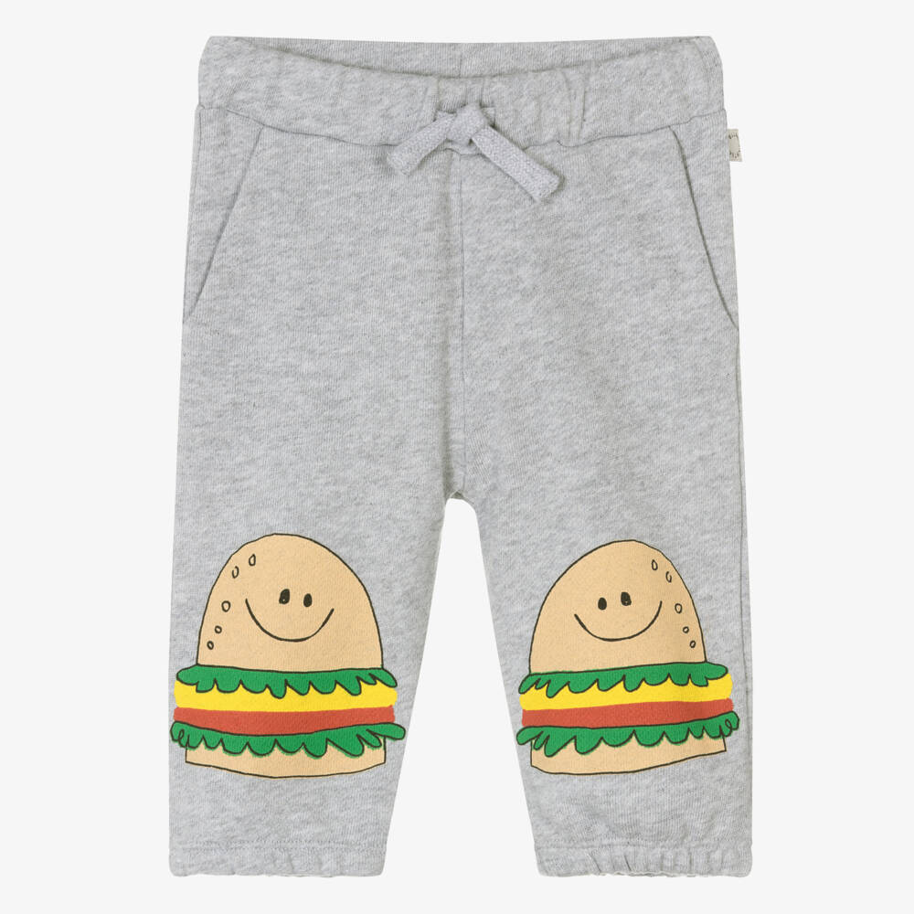 Fun grey marl joggers for little boys by Stella McCartney Kids, printed with quirky sandwiches on the knees. Made in soft organic cotton jersey, they are as eco-conscious as they are playful. For a comfortable fit, there is a drawstring fastening on the waist. The Stella McCartney fit can be quite small so choose a size up if you want room to grow.