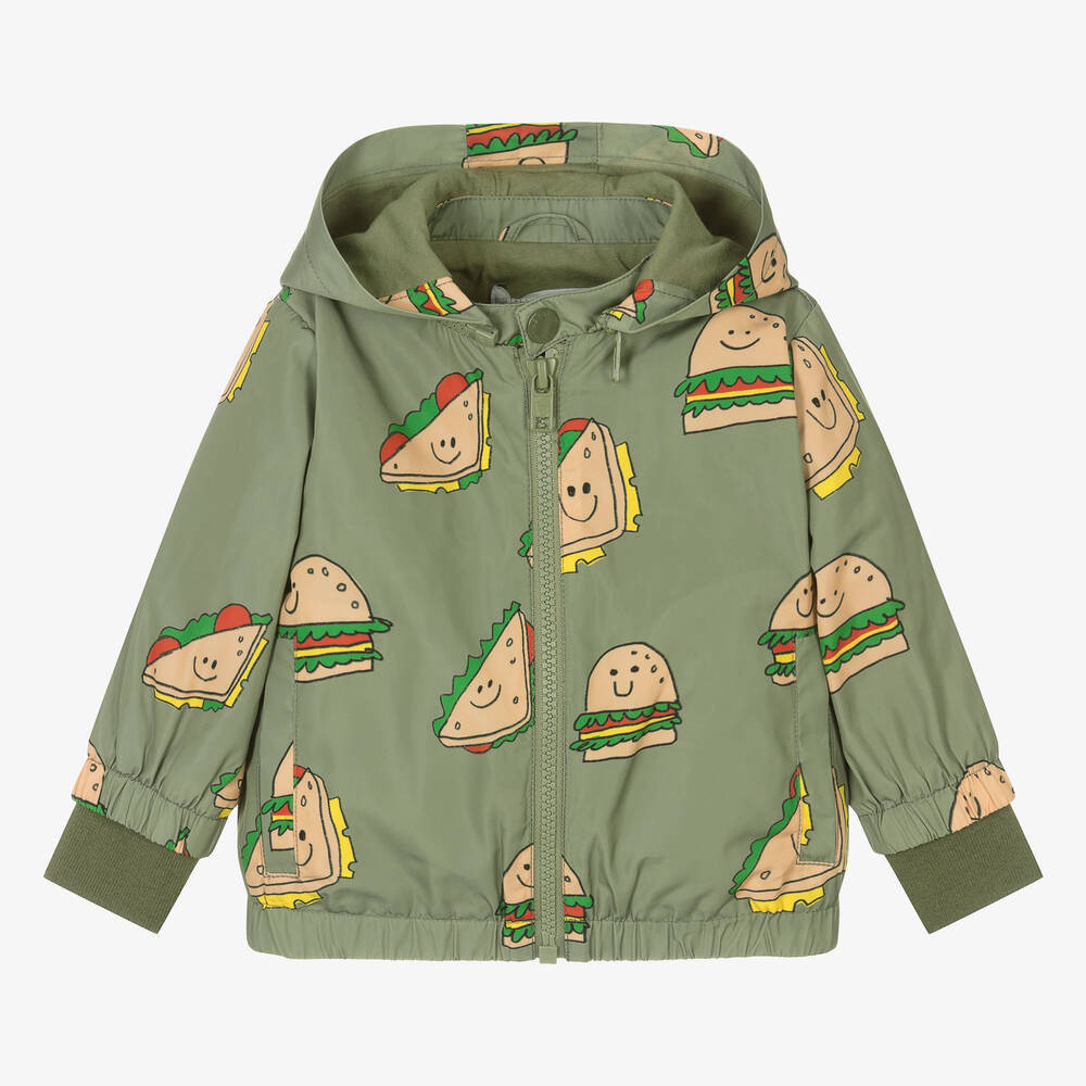 Eco-conscious khaki green hooded jacket for little boys by Stella McCartney Kids, made using recycled materials and lined in soft jersey for comfort. A cartoon sandwich print can be found across the outerwear style for a fun, quirky look. It simply fastens with a zip on the front and a popper on the neckline. The useful hood can be detached with a zip, offering versatile looks whatever the weather. The Stella McCartney fit can be quite small so choose a size up if you want room to grow.