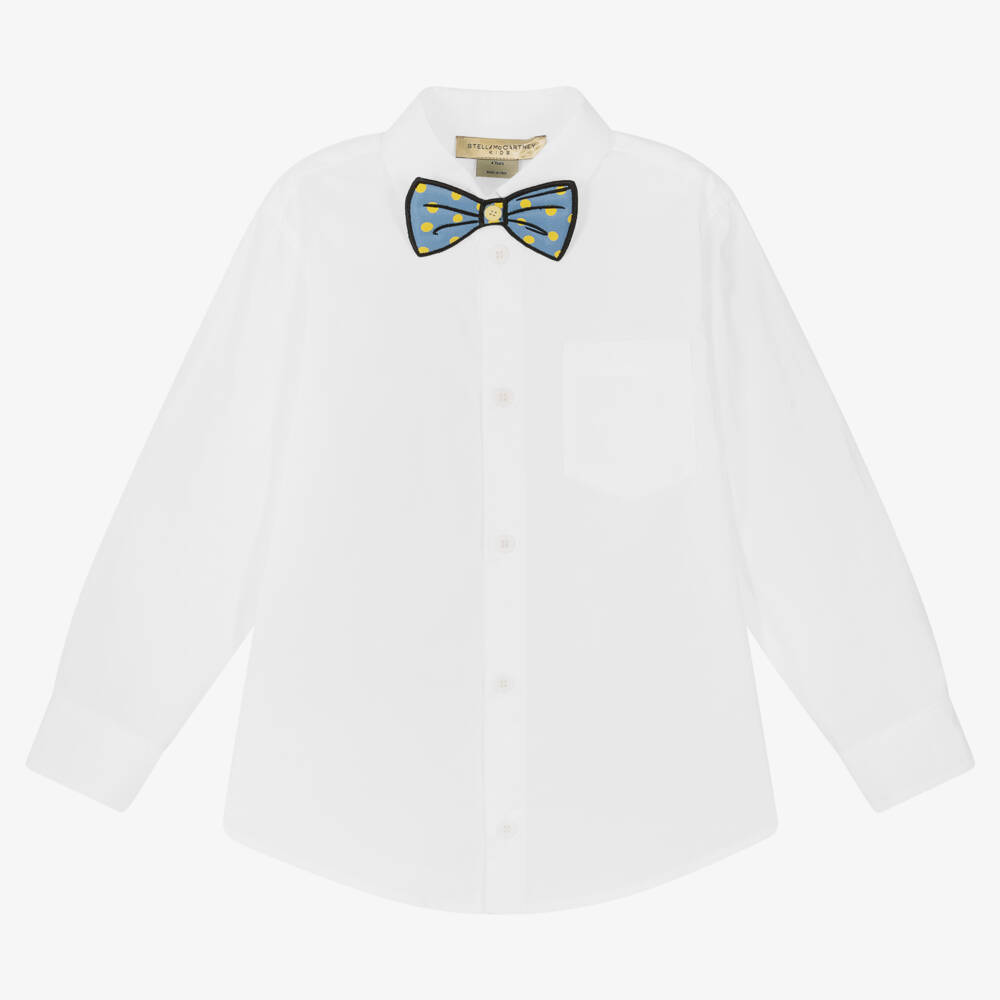 A fun white shirt for boys by Stella McCartney Kids, made in lightweight organic cotton poplin. Great for parties, this long-sleeved style has front button fastenings, barrel cuffs and a patch pocket on the chest. Synonymous with the designer's whimsical aesthetic, it comes with a detachable bow tie in a blue and yellow polka dot pattern. Black embroidered detailing gives it a cartoon-inspired, three-dimensional effect. The Stella McCartney fit can be quite small so choose a size up if you want room to grow.
