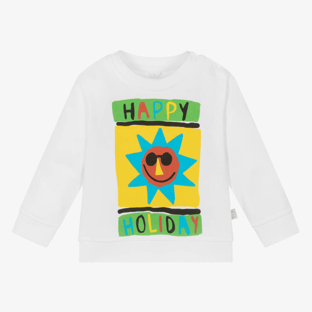 A vibrant white sweatshirt for little boys by Stella McCartney Kids, made from soft organic cotton jersey. Great for laid-back days, it has a fun smiling sunshine pattern and a colourful 'Happy Holiday' slogan printed on the front. Stretchy trims and shoulder popper fastenings complete this comfortable long-sleeved style. The Stella McCartney fit can be quite small so choose a size up if you want room to grow.