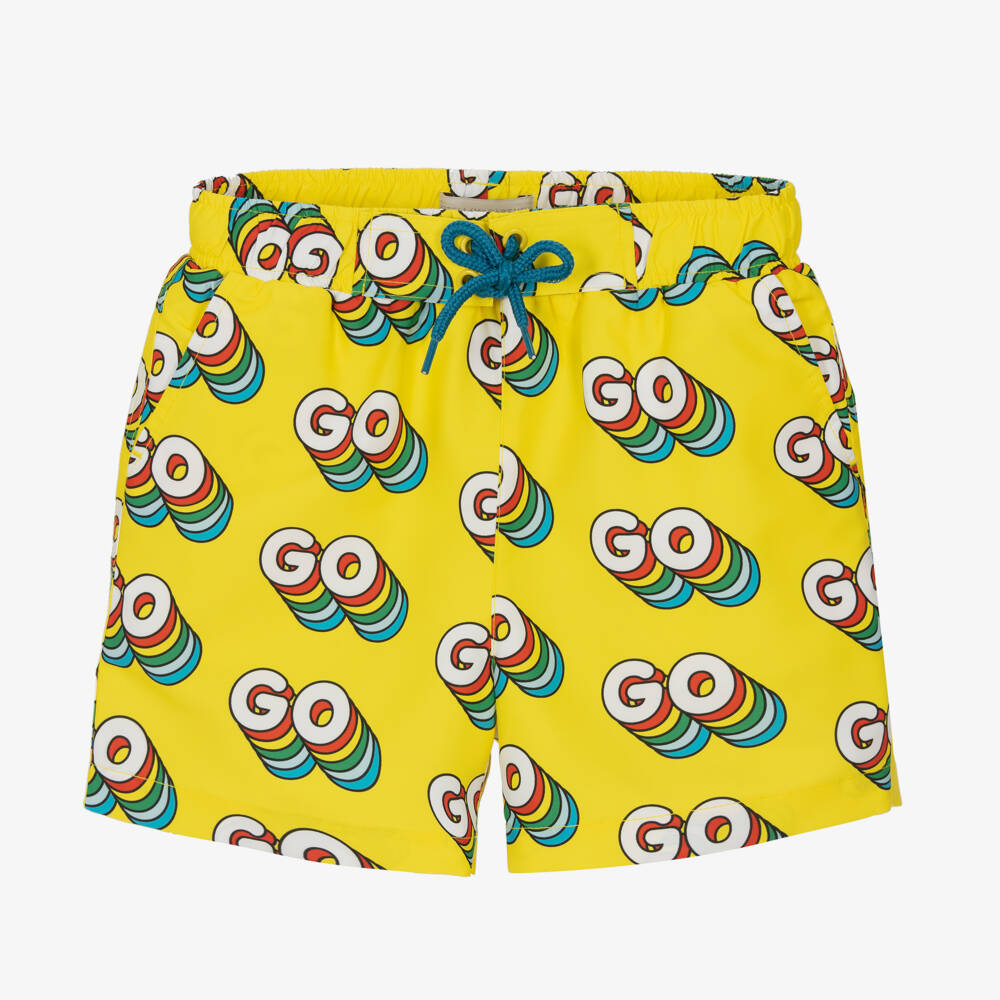 Bright yellow swim shorts for boys by British brand Stella McCartney Kids, with 'GO' printed in rainbow-coloured lettering. Silky smooth and vibrant, they are made from recycled fabric with a soft and comfortable mesh lining. Come with a branded storage pouch, they have an elasticated waistband with a blue tie string, two pockets on the front and a velcro-fastening back pocket.