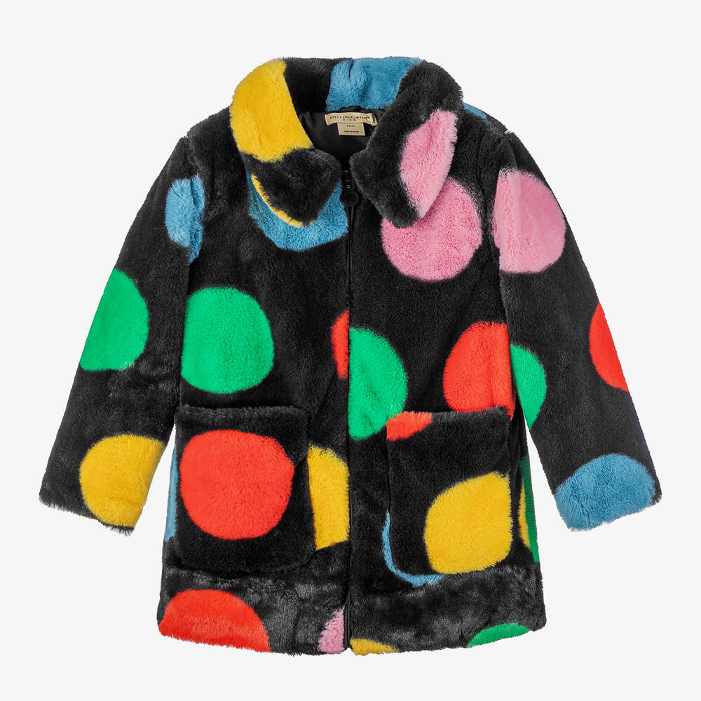 A fun black coat for girls by Stella McCartney Kids, made in beautifully soft faux fur. This long coat is patterned with big, multicoloured polka dots which stand out against the dark fabric. It has an oversized collar for extra cosiness and roomy front pockets to carry everyday essentials. The coat is lined with silky smooth fabric and fastens with a branded zip pull on the front. The Stella McCartney fit can be quite small so choose a size up if you want room to grow.