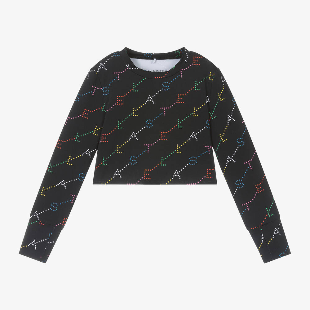 Black UPF50+ top for girls by British brand Stella McCartney Kids, with a colourful logo design. This sporty, cropped style is made in silky smooth and stretchy recycled fabric for comfortable wear and is designed with useful thumbholes on the cuffs. The Stella McCartney fit can be quite small so choose a size up if you want room to grow.