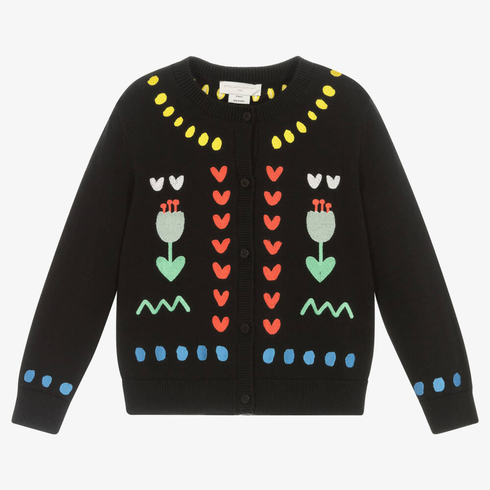 Beautiful black cardigan for girls by British designer Stella McCartney Kids, embroidered with a colourful, folklore-inspired pattern of tulips and hearts. Knitted in a warm, organic cotton and wool blend, it has cosy, ribbed trims and fastens on the front with logo buttons. The Stella McCartney fit can be quite small so choose a size up if you want room to grow.