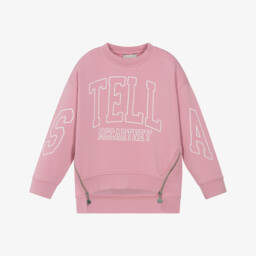 Black sweatshirt for girls by Stella McCartney Kids, with a bold varsity-style logo on the front and sleeves. It features unique zip detailing at the sides and a contemporary high-low hemline. In a comfortable relaxed fit, it is made in mid-weight organic cotton jersey, with a cosy fleecy inside.