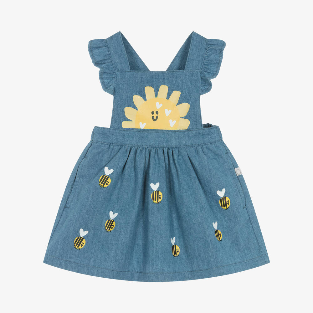 An adorable blue dress for girls by Stella McCartney Kids, made in soft and lightweight organic cotton denim. In a dungaree style, this sweet dress has a smiling yellow sun design on the bib front, with friendly bees printed all around the skirt. The waistband is elasticated for comfort and the frilled straps have adjustable button fastening straps. Concealed side seam pockets complete the casual look. The Stella McCartney fit can be quite small so choose a size up if you want room to grow.