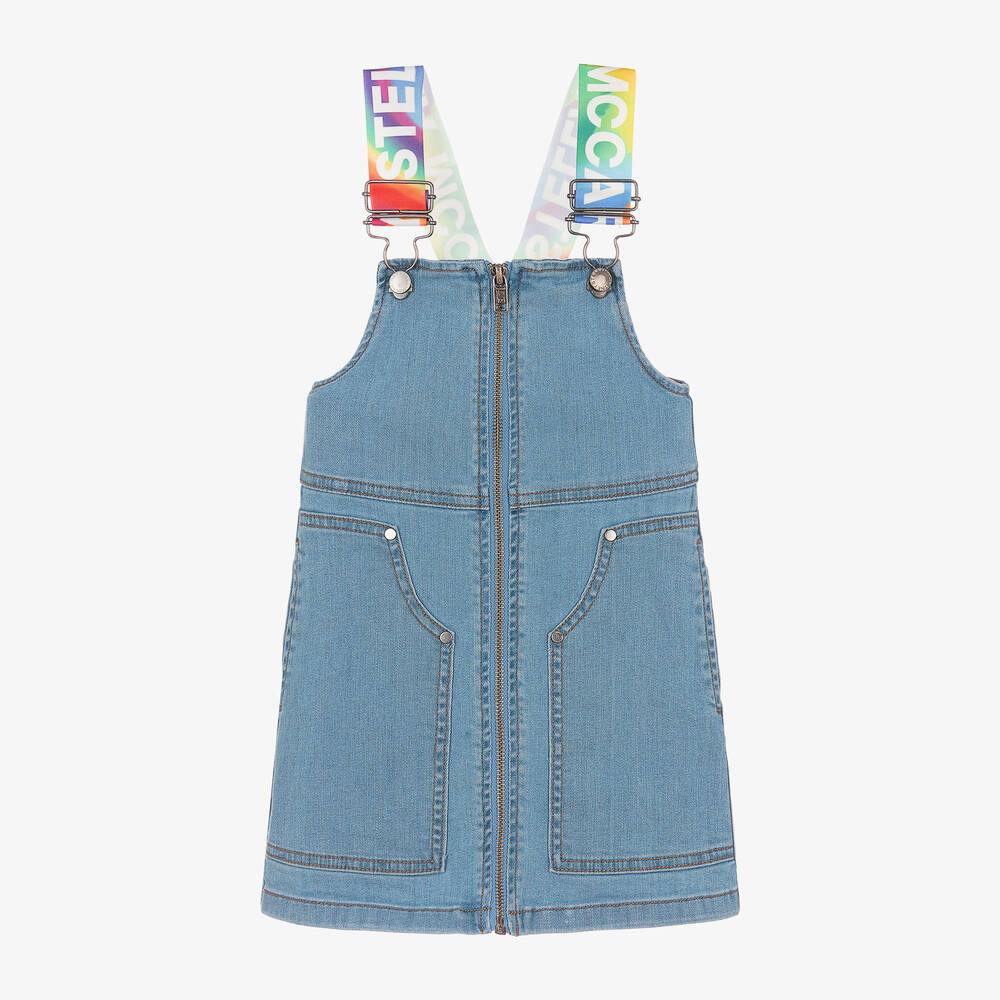 Washed blue denim pinafore dress for girls by Stella McCartney Kids, made in soft organic cotton denim with a slight stretch for comfort. Adding instant designer appeal, it has adjustable grosgrain shoulder straps with a colourful rainbow pattern and white repeat logo. The straps fasten with clips and branded buttons, and there is an exposed zip fastening on the front. Completing the look, there are large patch pockets with logo-embossed rivets. The Stella McCartney fit can be quite small so choose a size up if you want room to grow.