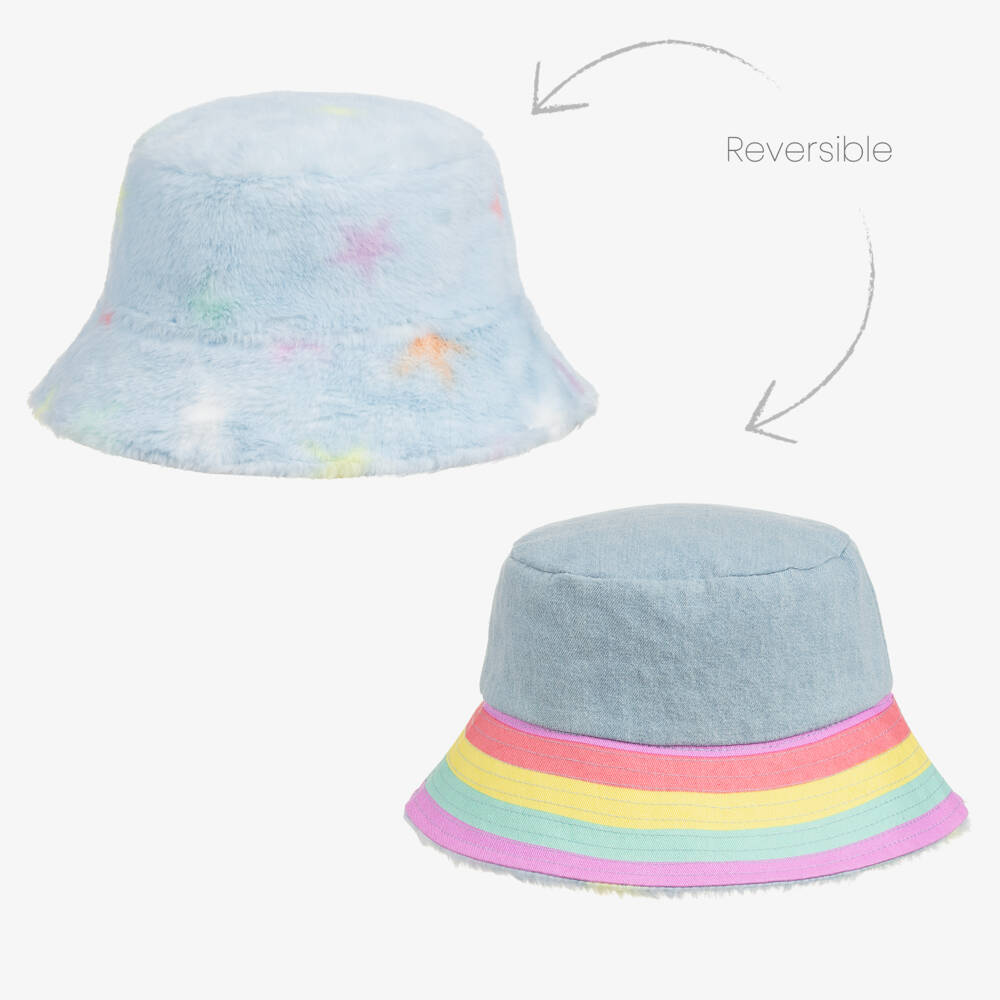 Reversible pale blue bucket hat for girls by Stella McCartney Kids. One side is super soft faux fur with a pastel star pattern, a signature look for the brand. The reverse is made in soft denim with a pale blue crown and rainbow striped brim.
