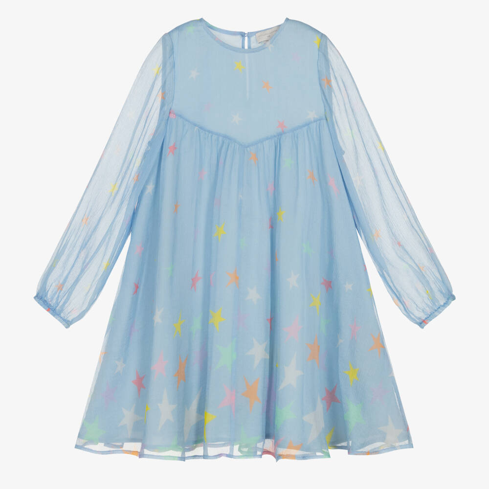 Gorgeous blue silk chiffon dress for girls by Stella McCartney Kids. Patterned in colourful stars, this softly pleated dress is made in a beautiful floaty design. The body of the dress is fully lined in a lightweight voile for comfort and modesty, and fastens with a keyhole button fastening on the back. For a pretty, feminine touch, the long sleeves are sheer with gently elasticated cuffs. The Stella McCartney fit can be quite small so choose a size up if you want room to grow.