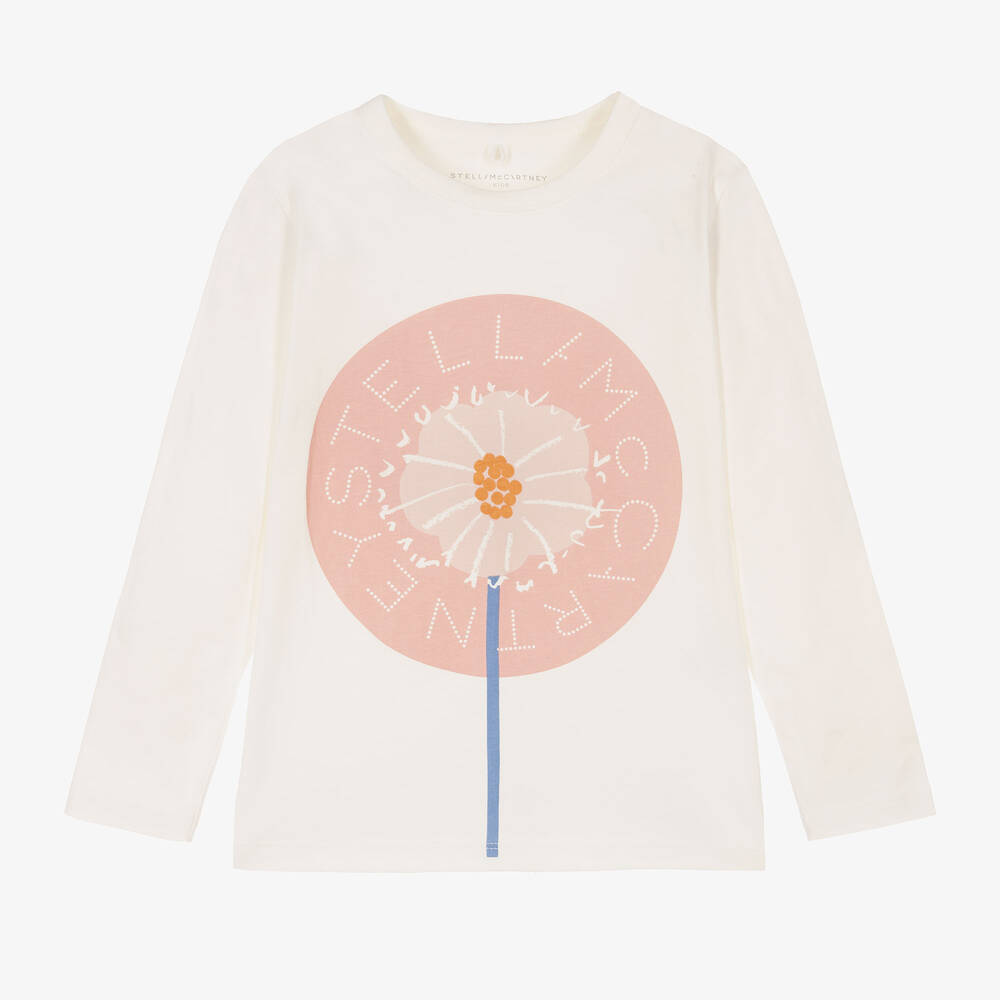 Ivory long-sleeved organic cotton top for girls by British brand Stella McCartney Kids, made in soft and comfortable jersey. Just right for adding a designer touch to casual days, it has the iconic circular disc logo printed in pink on the front with a lovely dandelion flower. The Stella McCartney fit can be quite small so choose a size up if you want room to grow.