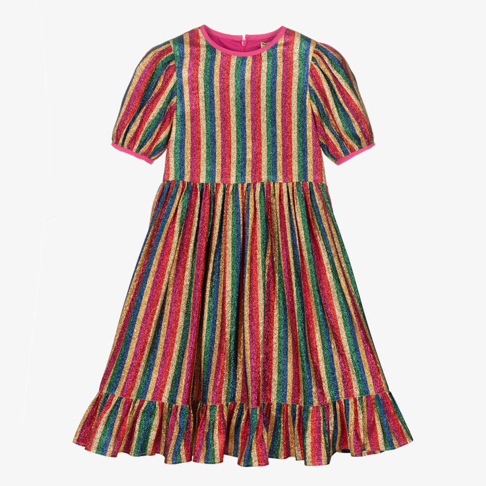 A striking, glittery rainbow stripe dress for girls by Stella McCartney Kids, made in a delicate viscose and silk blend. Ready-to-wear for any celebration, this colourful midi dress has puff sleeves and a ruffled hemline for fun festive styling. The concealed zip fastening and soft cotton lining offer a comfortable finish to the dress. The Stella McCartney fit can be quite small so choose a size up if you want room to grow.