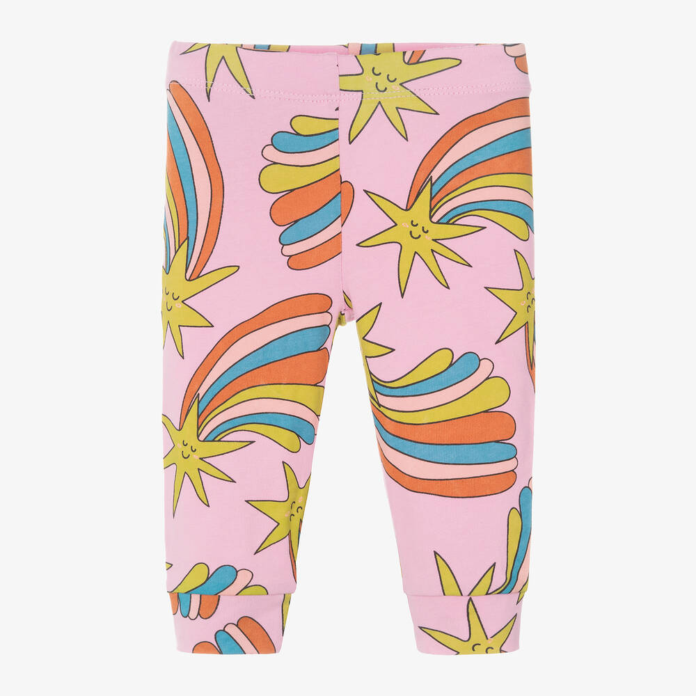 Pink leggings for younger girls by Stella McCartney Kids, made in soft organic cotton jersey. Both comfortable and casual, they are patterned with colourful shooting star characters for a playful look, with a gently elasticated waistband ensuring a good fit. The Stella McCartney fit can be quite small so choose a size up if you want room to grow.