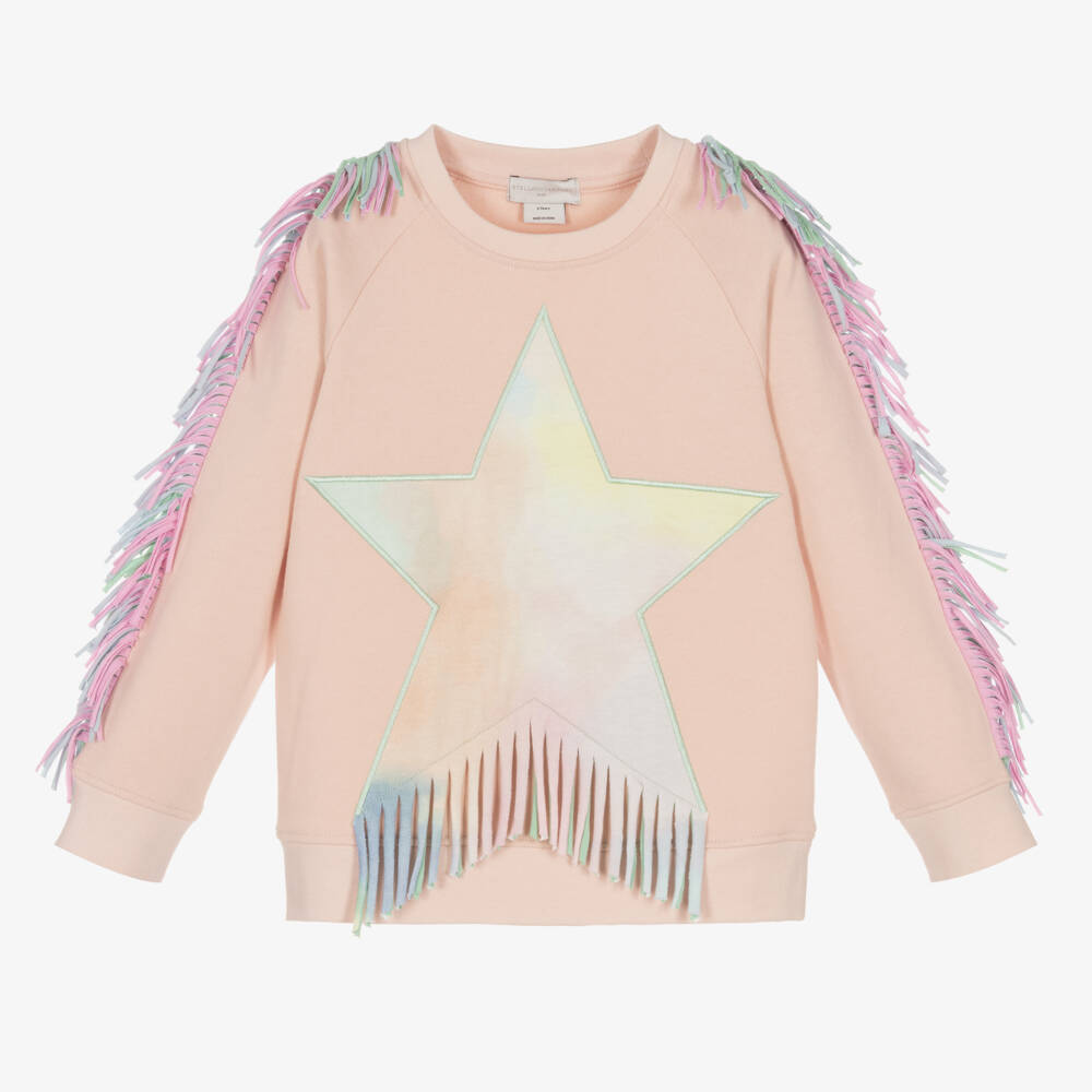 Gorgeous pink sweatshirt for girls by Stella McCartney Kids, made in soft, mid-weight organic cotton jersey. Easy to wear, this comfortable top has gently ribbed trims with a cosy fleece feel inside. There is an eye-catching tie-dye effect star on the front in green, pink and blue with matching fringing below and along each sleeve. The Stella McCartney fit can be quite small so choose a size up if you want room to grow.
