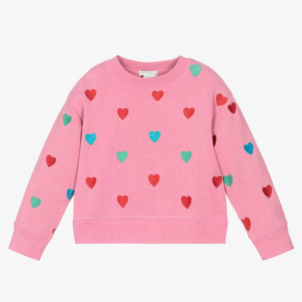 Pink organic cotton sweatshirt for girls by British designer Stella McCartney Kids. This cool and comfortable jersey sweatshirt has lovely hearts embroidered in sparkly red, blue and green thread for a sweet finish. The Stella McCartney fit can be quite small so choose a size up if you want room to grow.