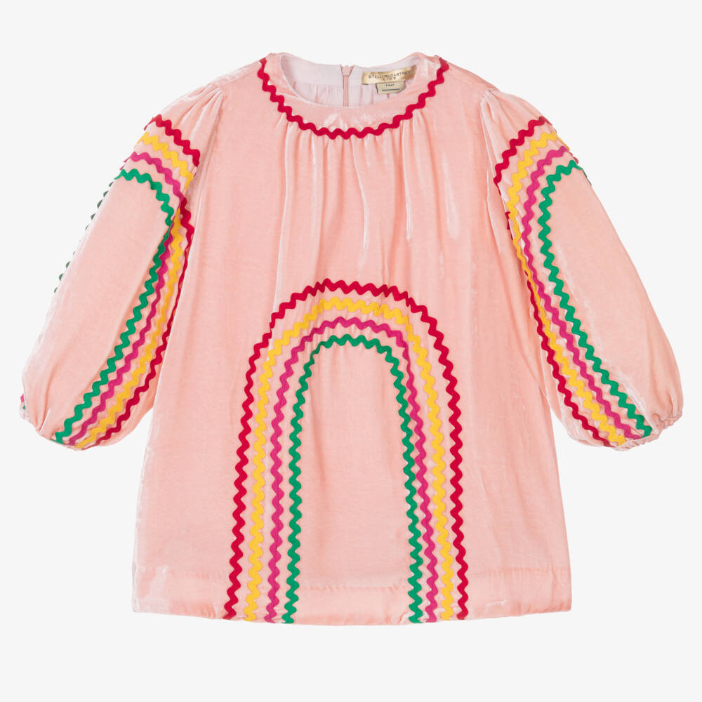 A delightful pale pink dress for girls by Stella McCartney Kids, made in luxuriously soft viscose and silk blend velvet. Sweet and whimsical, there are colourful rainbow ric rac trims on the front and on the balloon sleeves. It has a concealed zip fastening on the back, with a lightweight cotton voile lining for added comfort. The Stella McCartney fit can be quite small so choose a size up if you want room to grow.