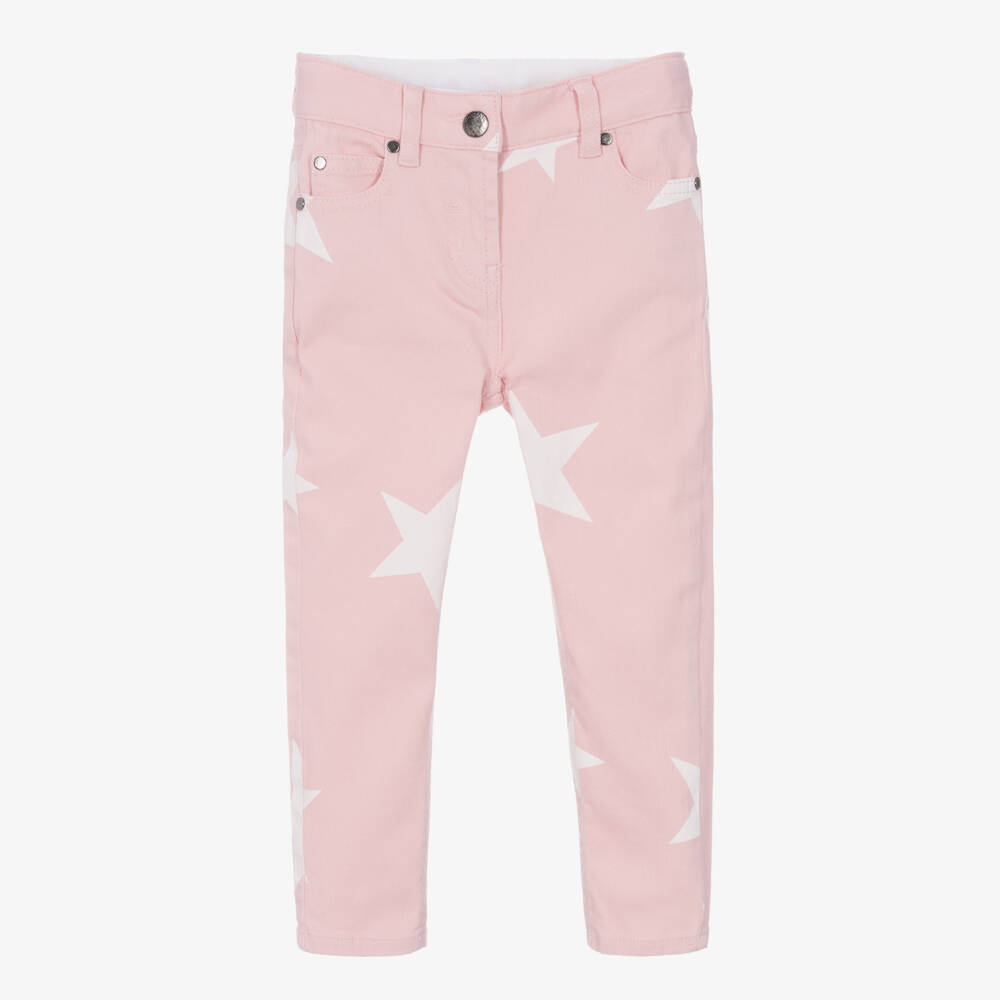 Pastel pink denim jeans for girls by Stella McCartney Kids, made from soft and stretchy organic cotton. These fun jeans have a white star pattern, with a logo tab on the back. Fastenings with a hook and zip, they have five-pocket styling and an adjustable waistband. The Stella McCartney fit can be quite small so choose a size up if you want room to grow.