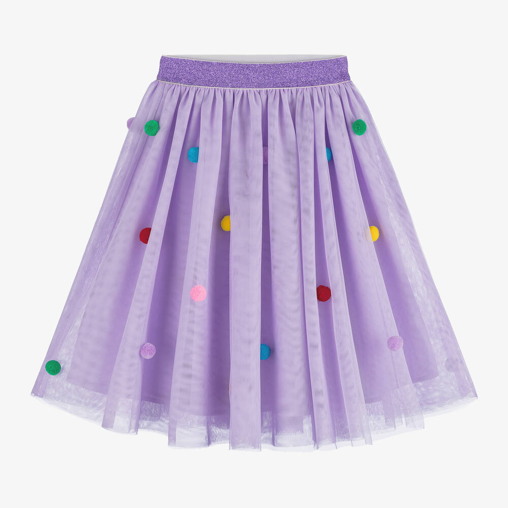 Lilac purple tulle skirt for girls by Stella McCartney Kids, decorated with 3D pom-poms for a colourful finish. Made with recycled fabric, this playful skirt has a stretchy lamé waistband, adding a touch of sparkle to any party look. Sitting below the knee, it has a soft and lightweight lining that feels gentle next to the skin. The Stella McCartney fit can be quite small so choose a size up if you want room to grow.