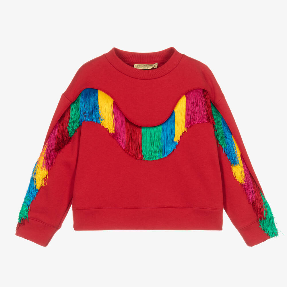 A bright red sweatshirt for girls by Stella McCartney Kids, made from soft organic cotton jersey. Adding a colourful element to this casual look, the top has playful fringed trims on the front. The Stella McCartney fit can be quite small so choose a size up if you want room to grow.