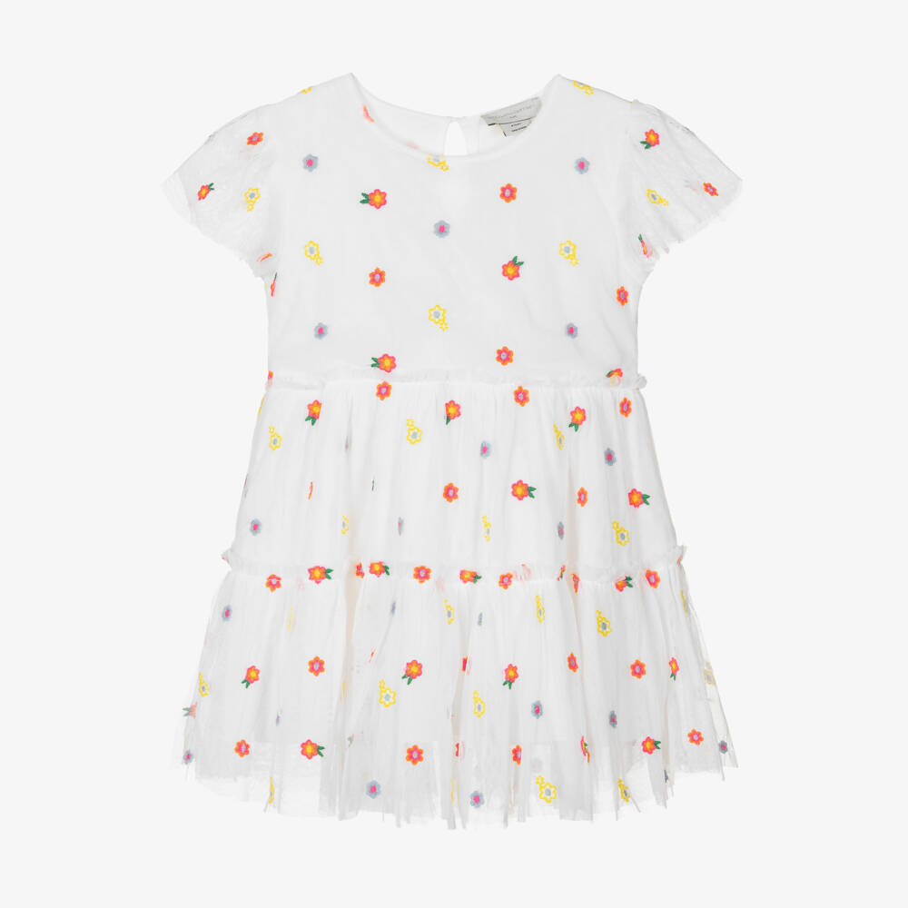 White dress for girls by Stella McCartney Kids, embroidered all over with fun and colourful flowers. Made in layers of soft tulle using recycled materials, it has pretty flutter sleeves and a feminine tiered skirt. Fully lined in lightweight cotton for comfort, the dress has a charming keyhole button fastening on the back. The Stella McCartney fit can be quite small so choose a size up if you want room to grow.