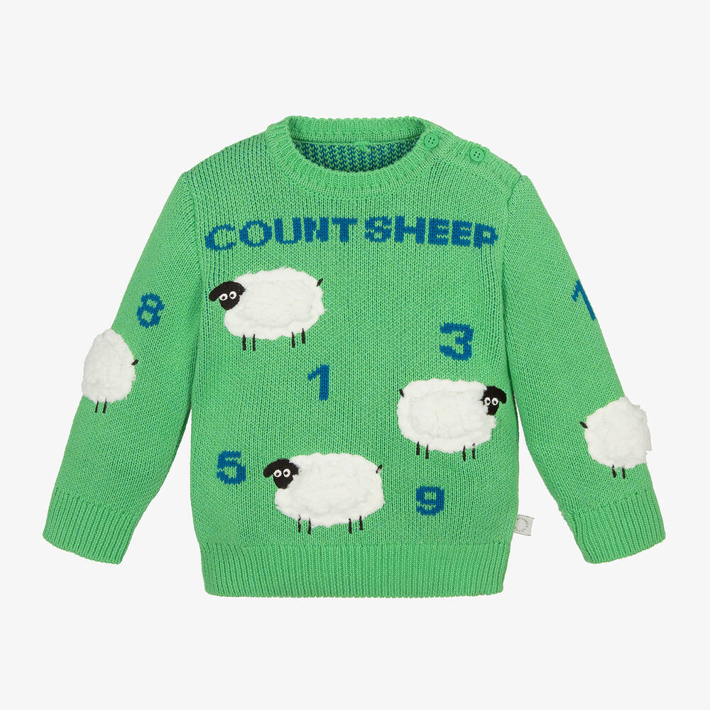 Cosy green sweater for boys and girls by Stella McCartney Kids, knitted in a soft organic cotton and wool blend. Featuring a fun farm theme, it has all-over fleecy sheep appliqués, with the words 'count sheep' and numerals 1 - 9 within the knit. Button fastenings on one shoulder help with dressing. The Stella McCartney fit can be quite small so choose a size up if you want room to grow.