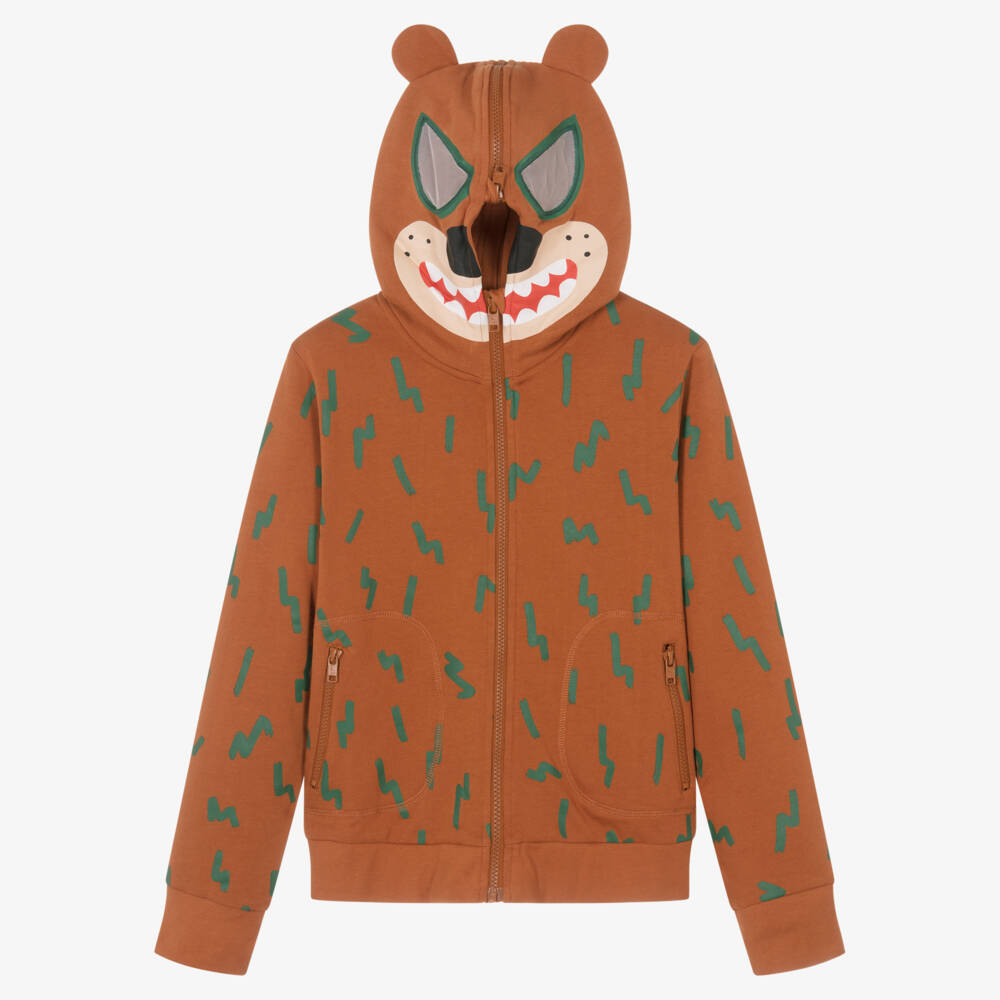 A brown organic cotton jersey zip-up hoodie for teen boys by Stella McCartney Kids, designed in the style of a bear. Quirky yet functional, the balaclava hood has mesh eyes so boys can see through the hood whilst keeping their faces covered. The body has a green camouflage-like print, with zips on the front and zip-up pockets. The Stella McCartney fit can be quite small so choose a size up if you want room to grow.