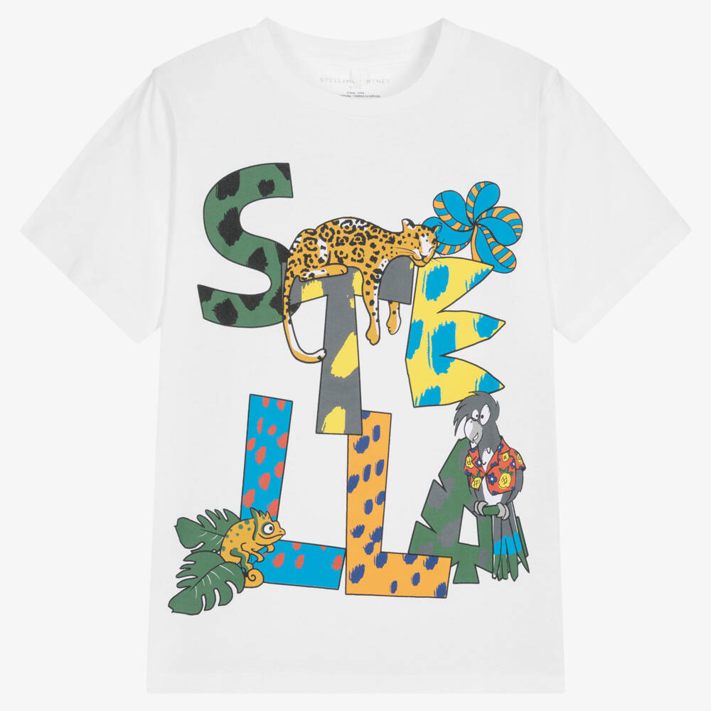 White T-shirt for teen boys by British brand Stella McCartney Kids, made in easy-wearing organic cotton jersey. In classic Stella style, it has a colourful jungle themed logo letter print on the front, for a typically quirky finish.