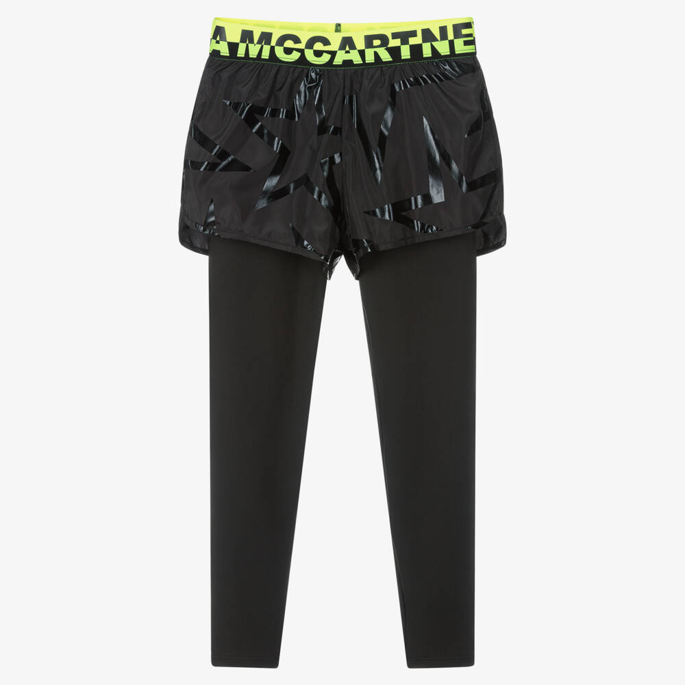 Black sports leggings for teen girls by Stella McCartney Kids, with attached shorts. Using recycled fibres, the leggings are made in stretchy technical jersey and the shorts are woven in silky soft fabric with a shiny star print. Great for activewear, the fabric is breathable, moisture wicking and fast drying. There is a neon yellow elasticated waistband with stand-out logo branding.