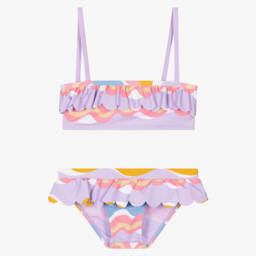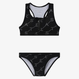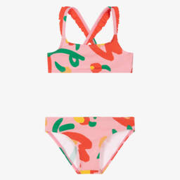 Teen girls geometric logo print bikini from Stella McCartney Kids, in red, yellow, orange and black. This vibrant, eye-catching design is made in silky, stretchy recycled fabric with UPF50+. The top has an exposed yellow zip fastening on the back with a branded pull and the bottoms have an elasticated waist with bold rubberised logo lettering for an unmistakable designer finish. The Stella McCartney fit can be quite small so choose a size up if you want room to grow.