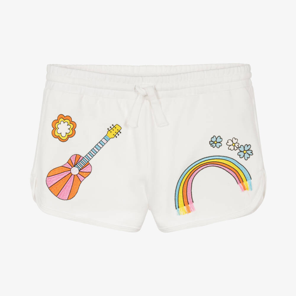 Ivory shorts for teen girls by British brand Stella McCartney Kids, complete with multicoloured, embroidered motifs on the front and further printed designs on the back. For an effortlessly cool and modern style, these casual shorts are made in soft organic cotton jersey with a practical drawstring waist. The Stella McCartney fit can be quite small so choose a size up if you want room to grow.