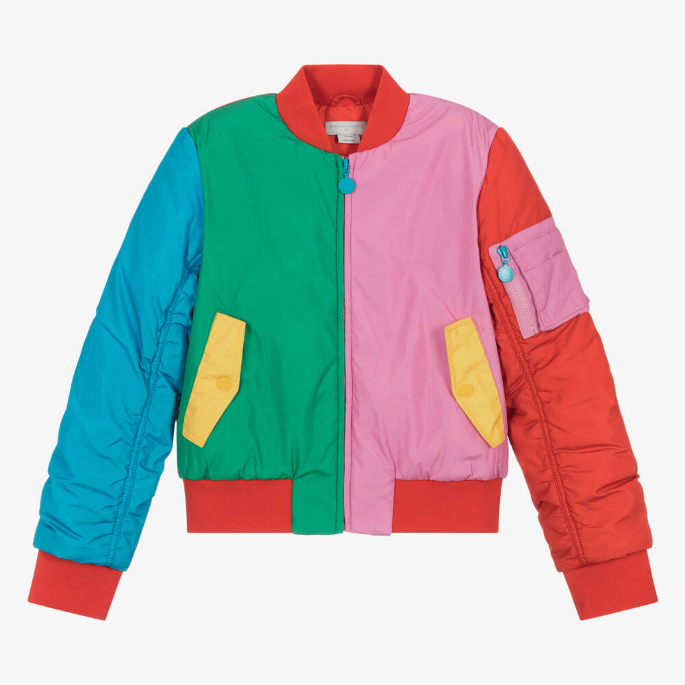 A colourblock bomber jacket for teen girls from Stella McCartney Kids, in the British label's signature bright colour palette. Signed with engraved branding on the poppers and zips, this pink, green, red and blue style is full of designer appeal. With soft ribbed trims, it has a utility pocket with a zip feature on the sleeve, popper-closing side pockets, and lightweight padding for warmth and shape. The sleeves are playfully ruched and the jacket unzips to reveal a colourful logo graphic on the front. This silky jacket is made with recycled materials. The Stella McCartney fit can be quite small so choose a size up if you want room to grow.