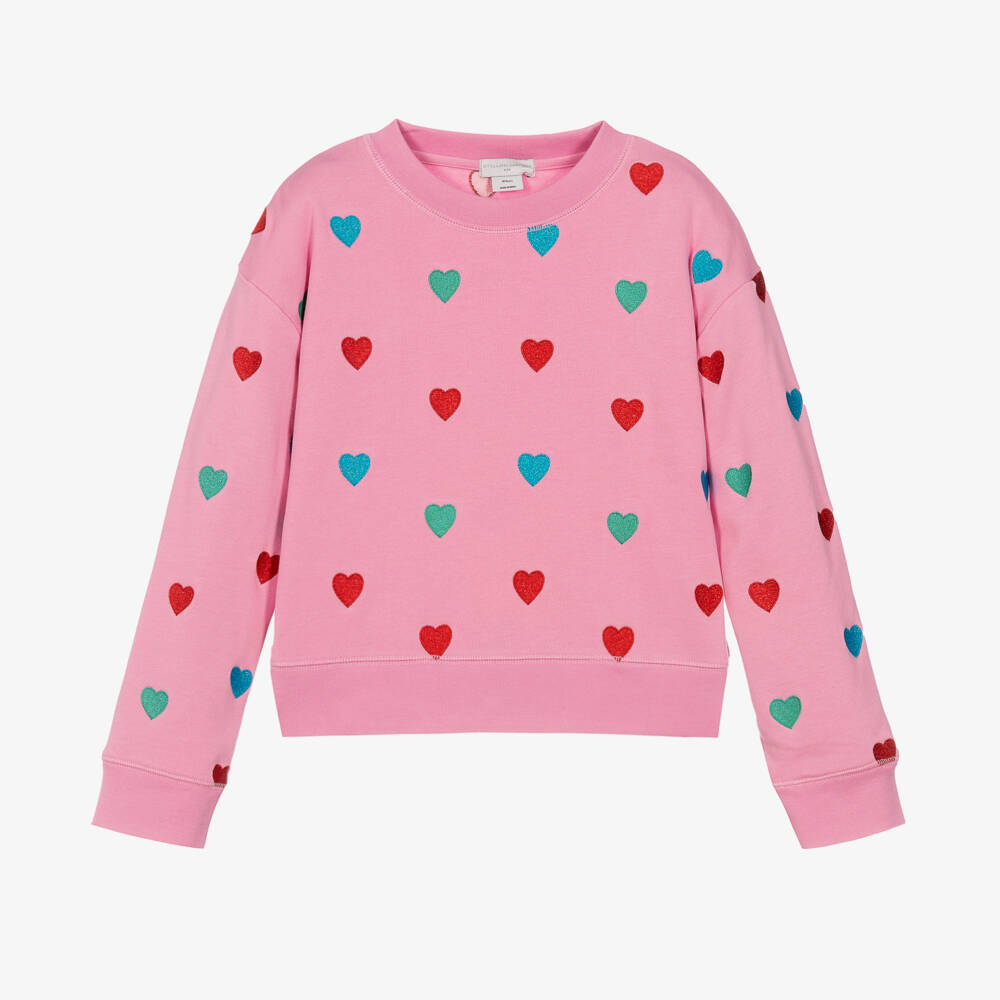 Pink sweatshirt for teen girls by British designer Stella McCartney Kids. Fun to relax in, it has eye-catching hearts embroidered all over in sparkly red, blue and green thread. Made in a comfortable organic cotton sweatshirt jersey, it has a casual crew neck and ribbed trims. The Stella McCartney fit can be quite small so choose a size up if you want room to grow.