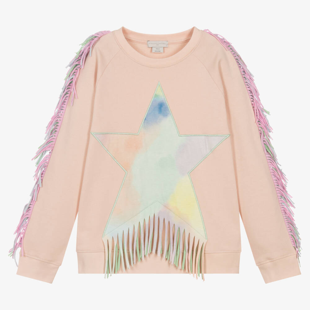 Fun pink sweatshirt for teen girls by Stella McCartney Kids. It has an eye-catching tie-dye effect star on the front in green, pink and blue with matching fringing below and along each sleeve. Easy to wear, this comfortable, casual top has gently ribbed trims and is made in soft organic cotton jersey with a cosy fleece feel inside for extra warmth. The Stella McCartney fit can be quite small so choose a size up if you want room to grow.