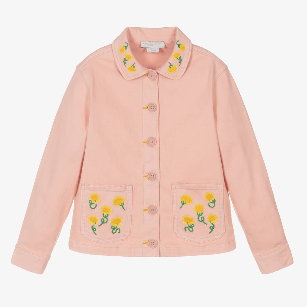 Blush pink denim jacket for teen girls by Stella McCartney Kids. With a stylish longer length, it has vibrant yellow and green embroidered sunflowers on the rounded collar and front patch pockets. Made in soft and stretchy organic cotton, it has branded button fastenings on the front and cuffs for a discreet designer finish. The Stella McCartney fit can be quite small so choose a size up if you want room to grow.