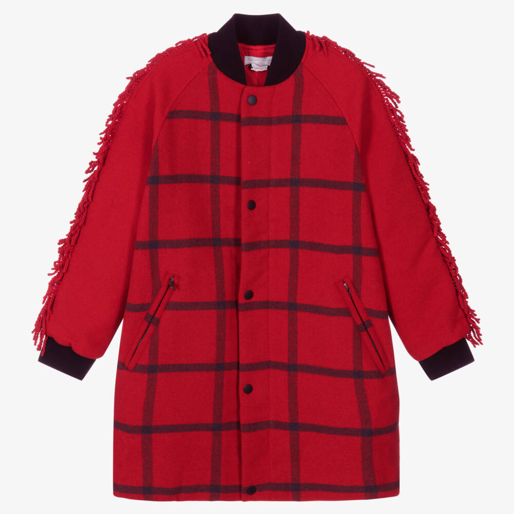 Eco-consciouis red wool blend coat for teen girls by Stella McCartney Kids, made with recycled materials. With funky fringing on the sleeves, it has a black check pattern and black ribbed trims on the collar and cuffs. It fastens with a concealed zip and poppers on the front and has zipped side pockets and a satin lining.