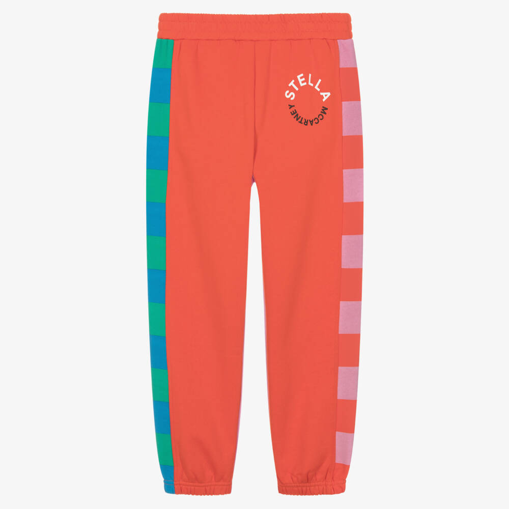 These colourful joggers for teen girls are by Stella McCartney Kids. Orange-red on the front and pink on the back, they have sporty blue and green striped panels on the side of one leg, with pink and red on the other. A black and white circular logo print on the front adds designer appeal and they have a comfortable elasticated waistband. Made in soft, mid-weight organic cotton jersey, they have a warm, fleecy feel inside. The Stella McCartney fit can be quite small so choose a size up if you want room to grow.
