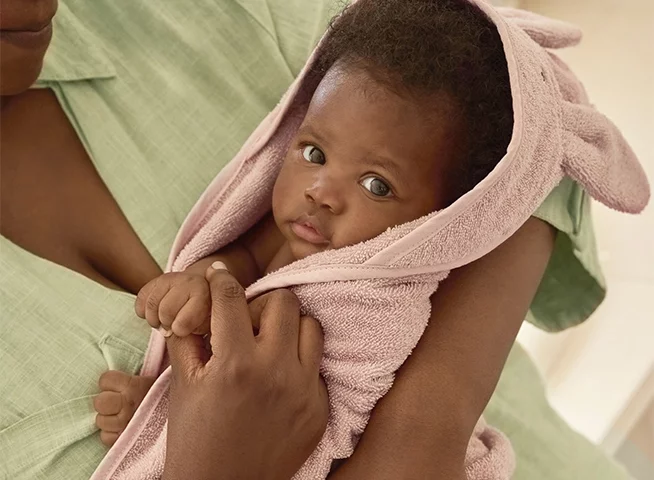 5- يجب أن تكون الغرفة دافئة، وأن تكون منشفة كيسي كيسي بغطاء رأس أو روب الحمام الشخصي من ماي فيرست ييرز في متناول اليد. وسيساعد لف منشفة ناعمة حول الطفل واحتضانه بعد الاستحمام في منحه الأمان والطمأنينة.