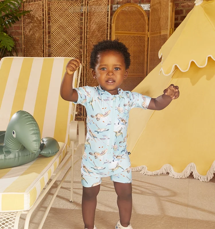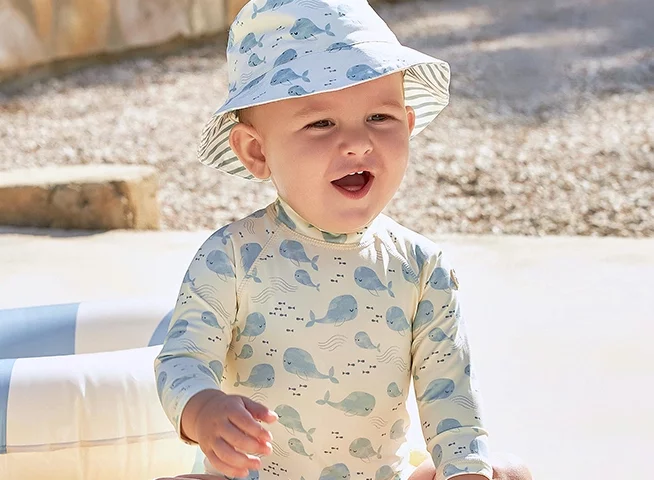 بشرة الصغير أكثر حساسية لأشعة الشمس ولا يكفي استخدام واقي الشمس بمفرده لتوفير الحماية الكافية لجلد الطفل. ولهذا يجب شراء ملابس السباحة الواقية من الأشعة فوق البنفسجية للرضع وحديثي الولادة عند الذهاب إلى الشاطئ أو المسبح. ابحثوا عن علامة +UPF40 و+UPF50 على ملابس السباحة ضمن تشكيلتنا المختارة، لأنها مصنوعة من خامات توفر أقصى قدر من الحماية للصغار. فهذه الخامات تحجب 98% من الأشعة الضارة، وإذا كانت طويلة الأكمام والأرجل ومزودة برقبة عالية، ستوفر الحماية الإضافية التي يحتاجها الصغير.