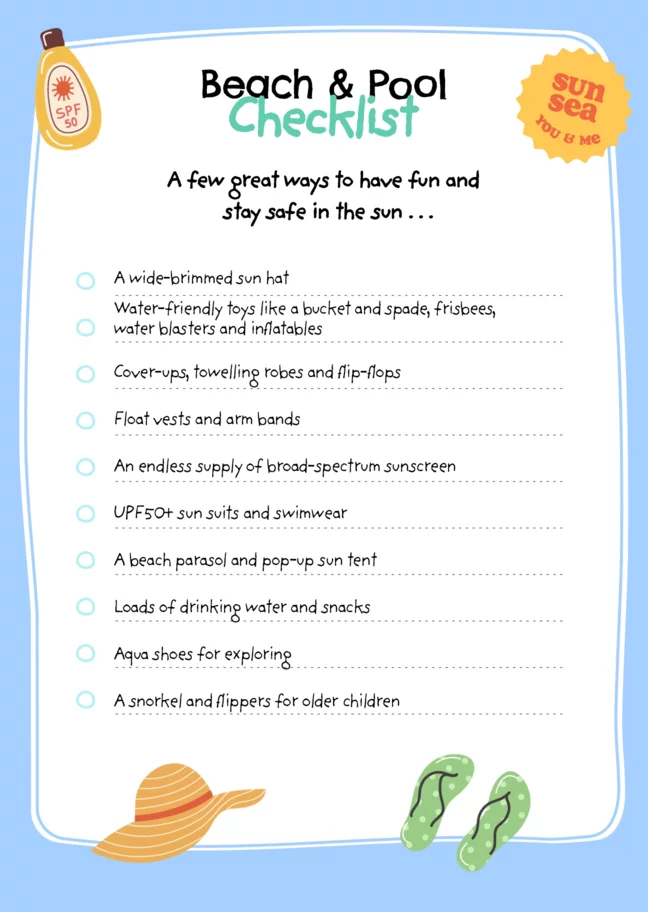 ينصح دائما بالتخطيط مسبقا لأنشطة مسلية للأطفال سواء على الشاطئ أو في المسابح لتجنب الشعور بالملل. ويسعد الأطفال دائما بالمشاركة في الألعاب التي تتضمن الإبداع أو حل الألغاز، وتفضل شاراي ألعاب تتطلب التفكير والتأمل. تقول شاراي: "لعبة البحث عن كنز القراصنة تسعد جميع أفراد العائلة. بإمكانكم ملء كيس بعملات القراصنة وتخبئته أو دفنه في الرمال، وارسموا خريطة تتضمن أدلة على مكان الكنز، وقد يتعاون الأطفال الأكبر سنا مع أشقائهم الصغار في حل الألغاز، وقد تساعد اللعبة الأطفال في تكوين صداقات مع أطفال أخرين". وتعد السباحة في البحر أو المسابح من الأنشطة التي يعشقها الأطفال دائما، ويقترح جوردون المشرف على أحواض السباحة بنادي Purple Dragon إشراك الأطفال في لعبة مغامرات تسمى Weather Whimsy. تتطلب اللعبة أن يصيح أحد البالغين بأحوال الطقس المختلفة ويتحرك الأطفال بحركات تتماشى مع كل طقس في الماء. ويكون الأطفال مفعمين بالنشاط والمرح عندما يؤدون حركات الأمطار والرعد والبرق. أما عن الإطلالات، فينصح دائما باختيار ملابس السباحة الواقية من الشمس بعامل حماية UPF50+، واصطحاب ألعاب للشاطئ والدمى والألعاب القابلة للنفخ وقبعة للوقاية من الشمس.
