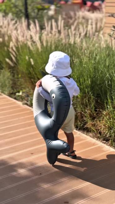 ما الذي يرتديه مطر: توب السباحة بأكمام طويلة من رالف لورين من القطع الأساسية التي لا غنى عنها للمسبح. هذا التوب مصنوع من قماش واقي من الشمس بعامل حماية UPF50+. نسقنا هذا التوب مع شورت سباحة أصفر فاتح من لايوود وقبعة شمس أنيقة. أما منشفة البونشو من ميتي جيمس المصنوعة من قطن تيري، فهي مثالية لتجفيف الطفل بعد السباحة.