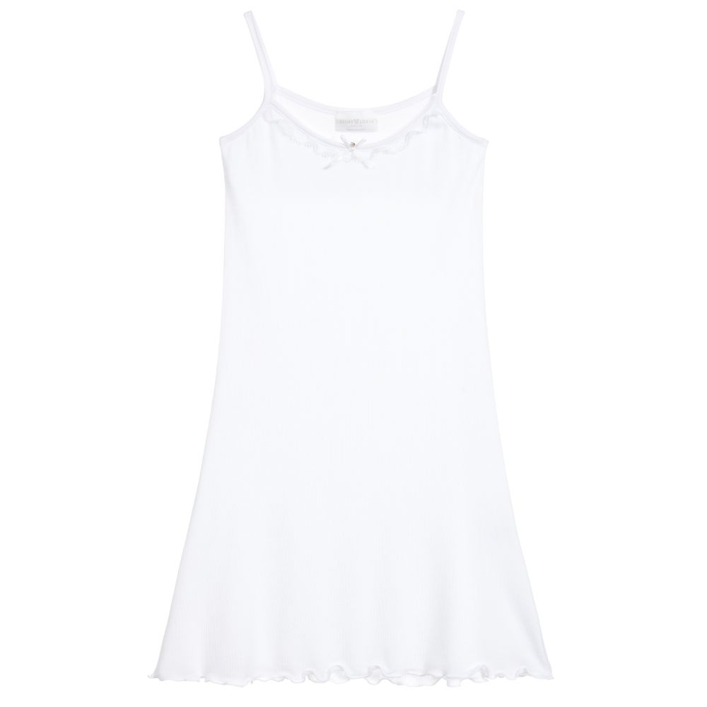 Girls luxury white night dress by Story Loris, made in super-soft, ribbed micromodal jersey. It has a ribbon bow by the neckline with a sparkling diamanté and a lace trim. It has a pretty ruffle around the hemline.