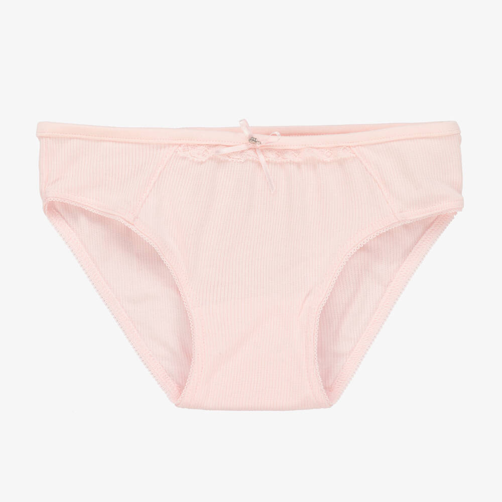 Girls pale pink knickers by Story Loris. Made with luxuriously soft, ribbed modal jersey, they have a silky bow with a diamanté embellishment on the front. There are pretty picot trims and delicate lace details.