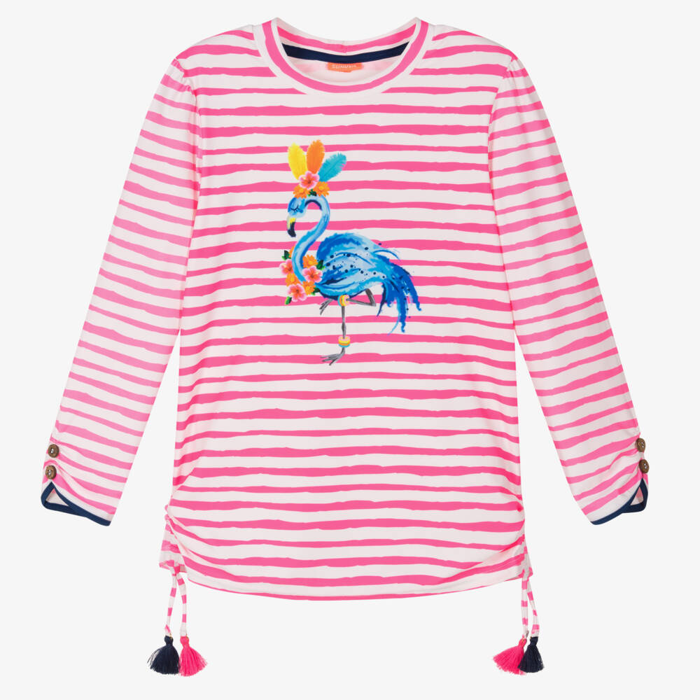 In vibrant pink and white, a striped swim top for teen girls from Sunuva with a beautiful blue flamingo print on the front. Made in stretchy recycled fabric, this long-sleeved rash vest has pretty ruched detail on the cuffs and hem, with decorative coconut buttons and tassel trims in pink and blue.