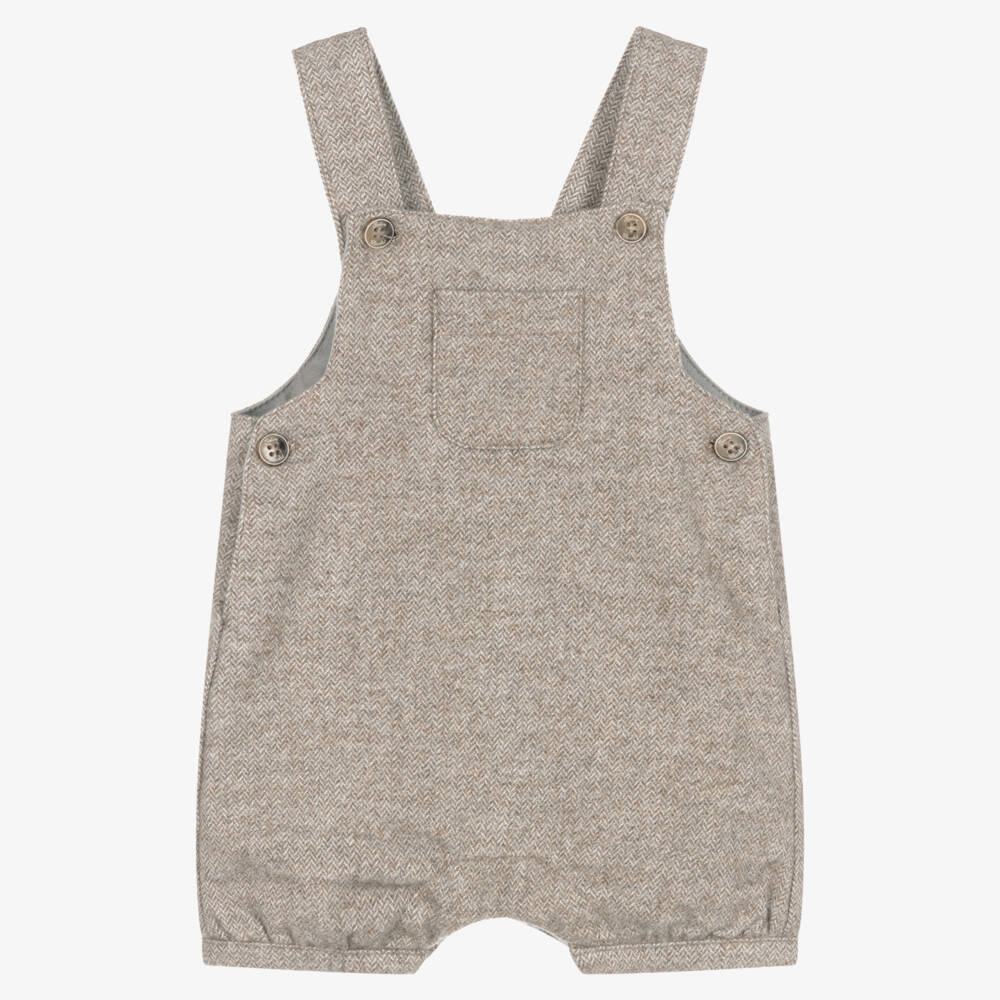 A pair of cotton dungaree shorts for baby boys by Tartine et Chocolat, woven in grey and brown herringbone. Classically styled, they have a cute pocket on the bib front and adjustable, button-fastening shoulder straps. There are additional buttons on each side and gently elasticated leg openings for added comfort. Popper fastenings between the legs help with dressing and nappy changing.