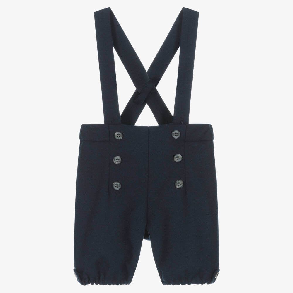 Navy blue dungaree shorts for little boys by Tartine et Chocolat, made from a soft viscose blend with a hint of stretch. Classically styled, they have detachable shoulder straps that fasten with buttons and crossover on the back. They can also be adjusted with buttons for a suitable fit. Decorative, branded buttons can be seen on the front and on the elasticated legs. Fully lined for comfort, the adjustable waist can be altered to ensure a comfortable feel on tiny tummies.