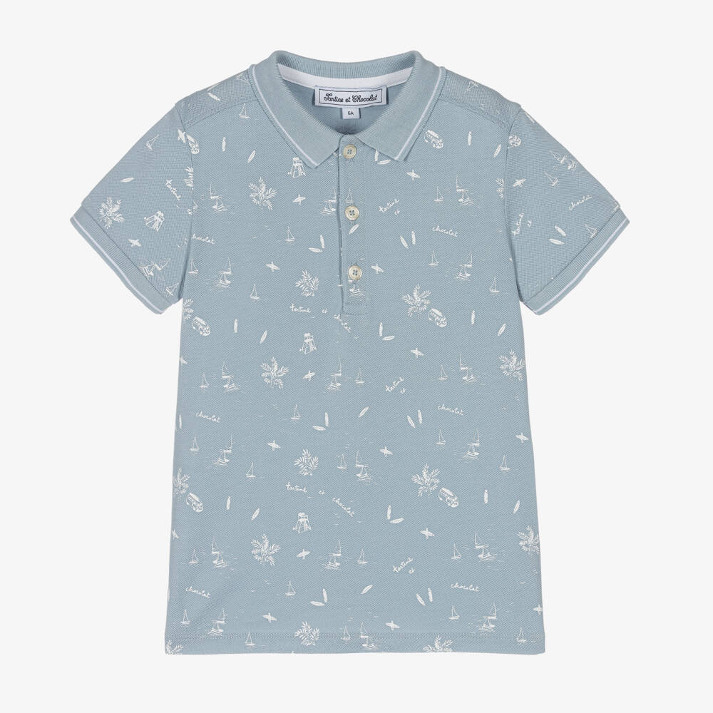 Light blue polo shirt for boys by Tartine et Chocolat, made in soft and stretchy cotton piqué. Cool and comfortable, it has a white all-over beach-themed design, with boats, camper vans and surfboards interspersed with logos. There are white striped trims on the ribbed collar and cuffs and logo-branded button fastenings on the front.