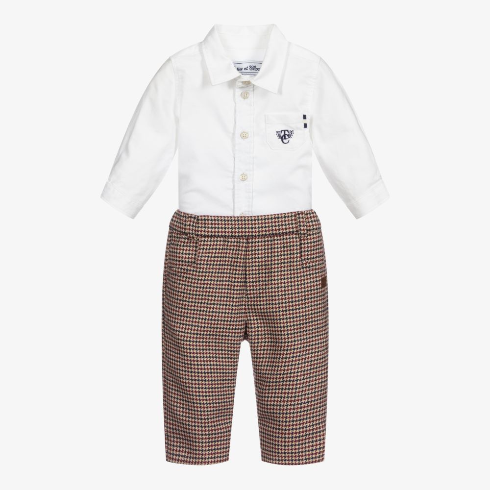 White and red check trousers set for little boys, by Tartine et Chocolat. Made from soft, lightweight cotton, the shirt has a cute pocket with a navy blue embroidered logo. It comes with soft red and navy blue houndstooth print trousers to complete the smart look.